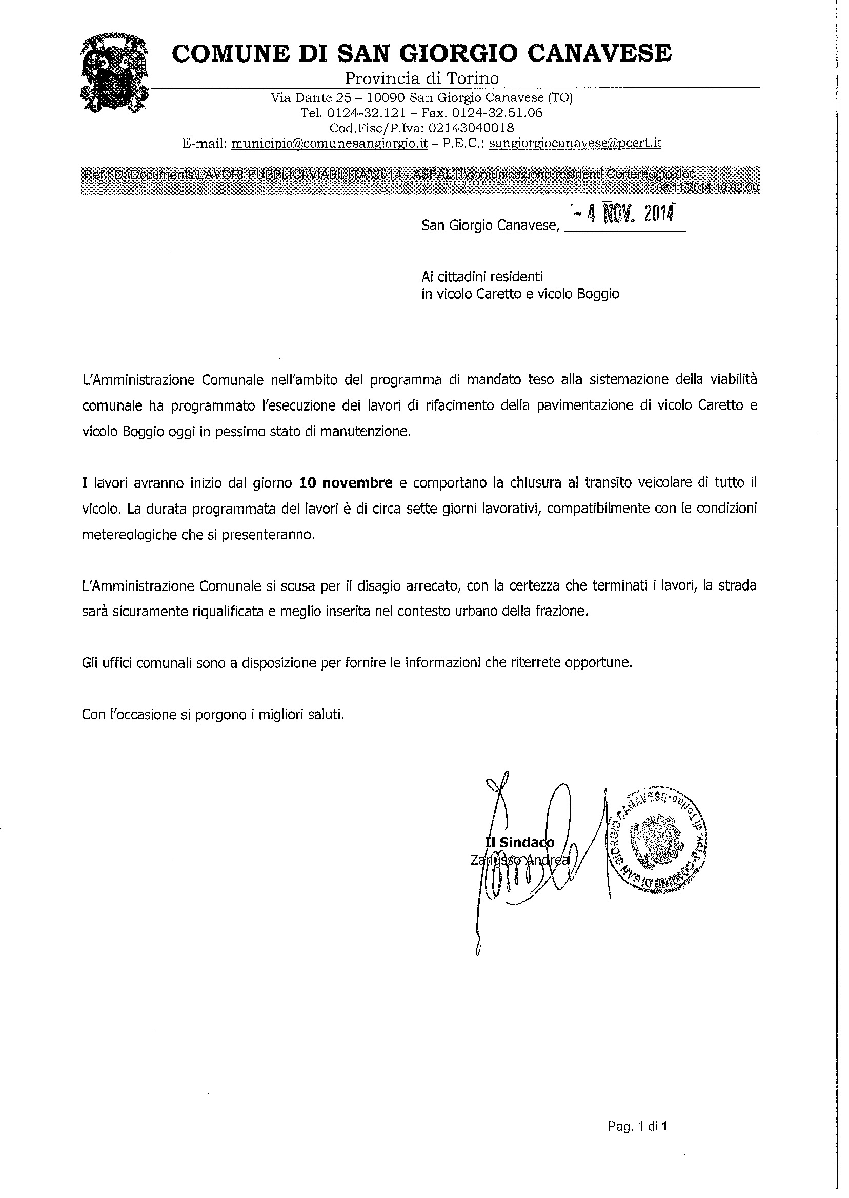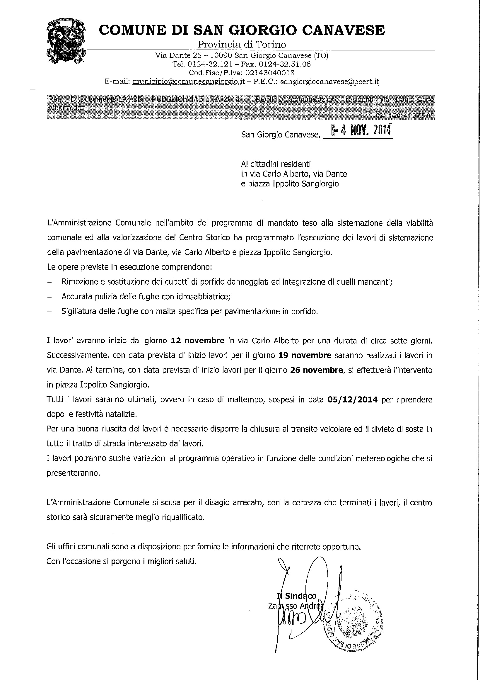 L'Amministrazione Comunale nell'ambito di mandato teso alla sistemazione della viabilità comunale ha programmato una serie di lavori di rifacimento della pavimentazione stradale nel Capoluogo e nella Frazione. Tali lavori si inseriscono nel più ampio progetto di RIVALORIZZAZIONE E RIVITALIZZAZIONE DEL CENTRO ABITATO. Con la certezza di ottenere al termine una sicura riqualificazione dell'abitato, ci scusiamo per i disagi arrecati. Le opere saranno terminate, o in caso di maltempo sospese, in data 05/12/2014 per eventualmente riprendere dopo le festività natalizie.