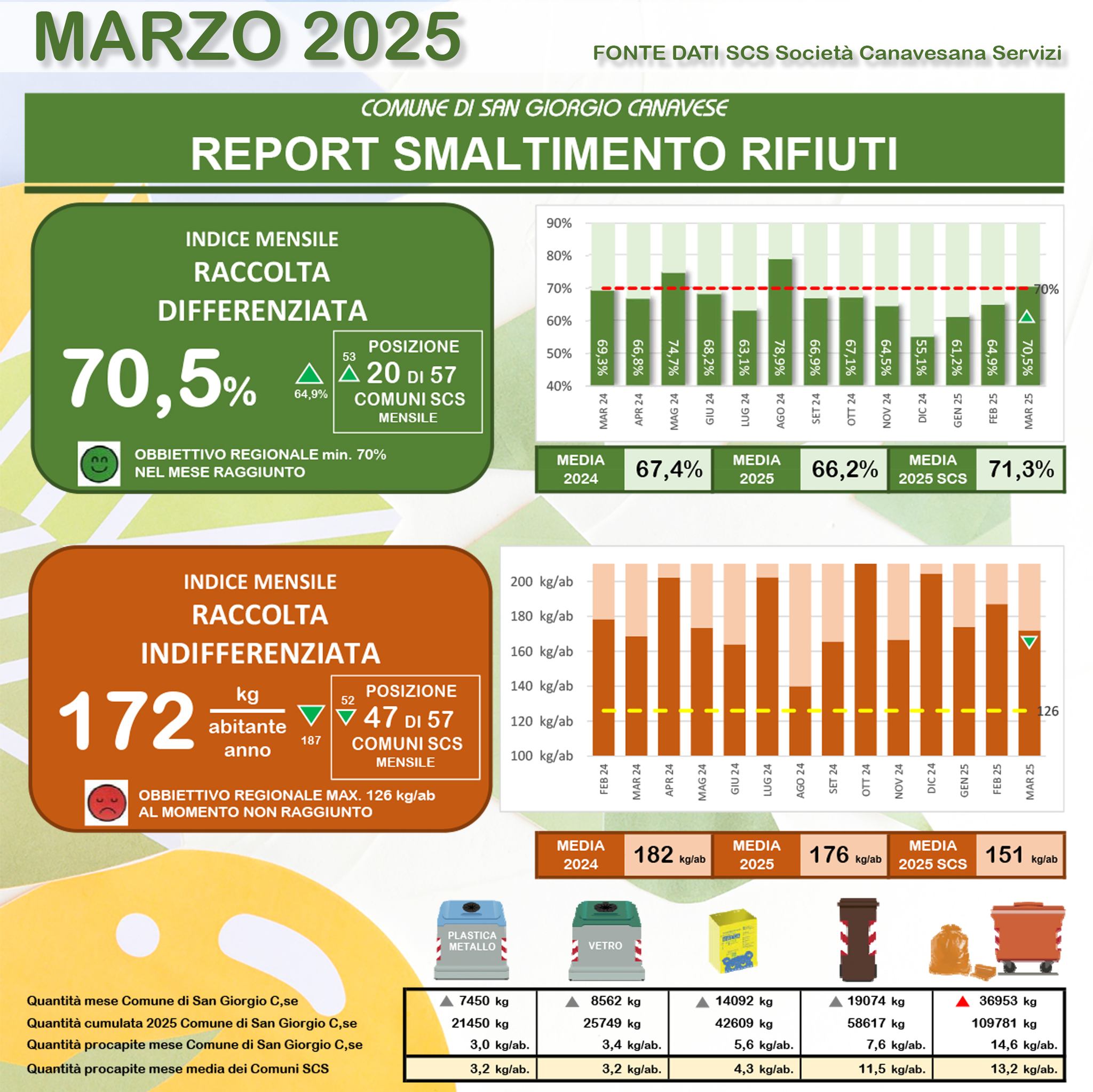 Dall'analisi dei dati mensili forniti da SCS per il mese di marzo 2025 il Comune di San Giorgio migliora il livello di differenziazione con il valore di 70,5%, raggiungendo il limite regionale pari almeno al 70%. Purtroppo per l'indifferenziata aumenta la quantità in termini assoluti (si riduce l'indice mensile procapite annuo solo grazie al fatto che il mese di marzo ha più giorni di febbraio).
