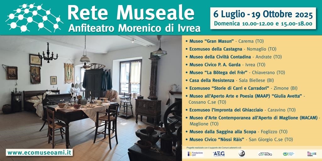 I siti museali che fanno parte della Rete Museale AMI, fra cui anche il Museo Nòssi Ràis di San Giorgio Canavese, apriranno le poro porte ai visitatori durante il periodo estivo ogni domenica dal 6 luglio al 19 ottobre 2025 dalle 10.00 alle 12.00 e dalle 15.00 alle 18.00.