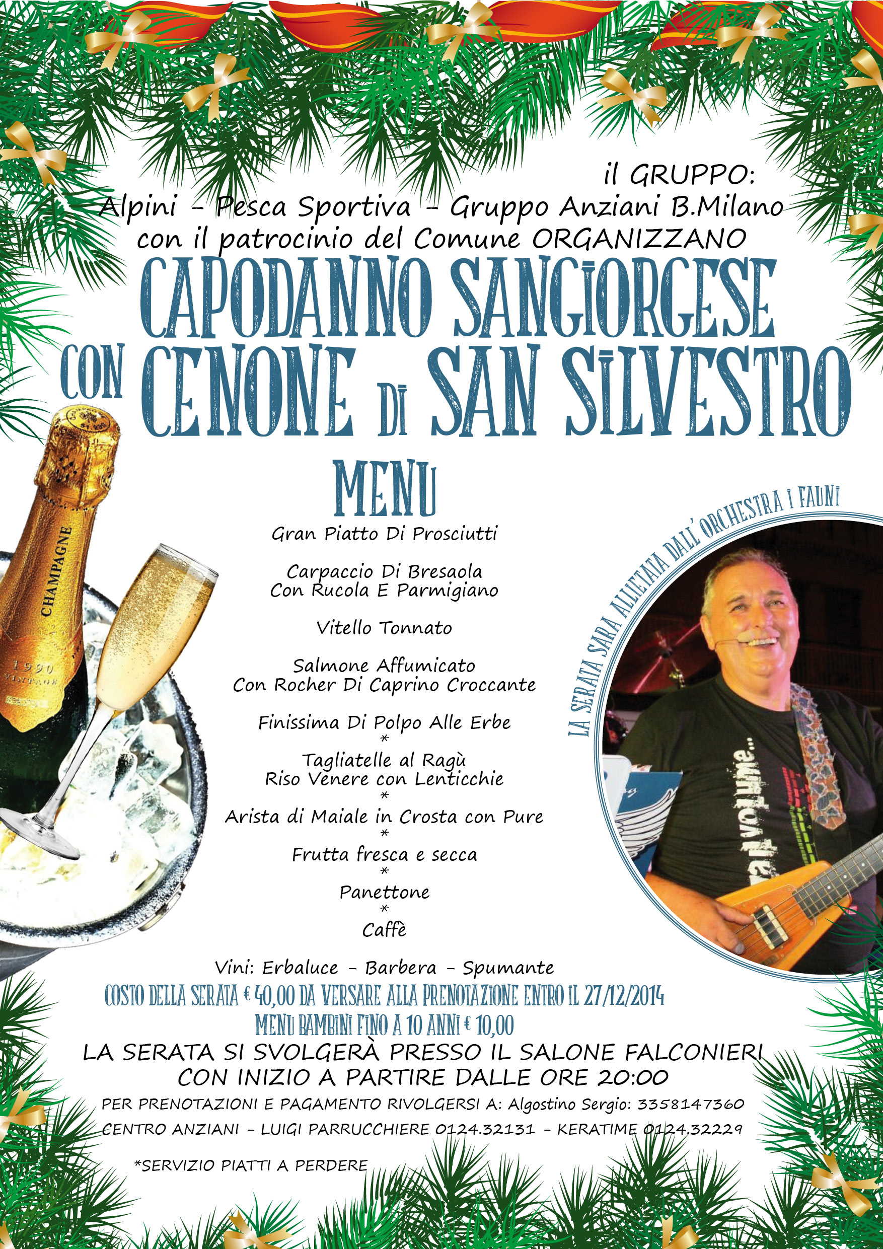 Il gruppo: ALPINI, PESCA SPORTIVA e GRUPPO ANZIANI B.MILANO organizzano il CENONE DI SAN SILVESTRO presso il Salone Pluriuso Falconieri a partire dalle ore 20:00 di MERCOLEDI 31 DICEMBRE. La serata sarà allietata dall'ORCHESTRA I FAUNI.