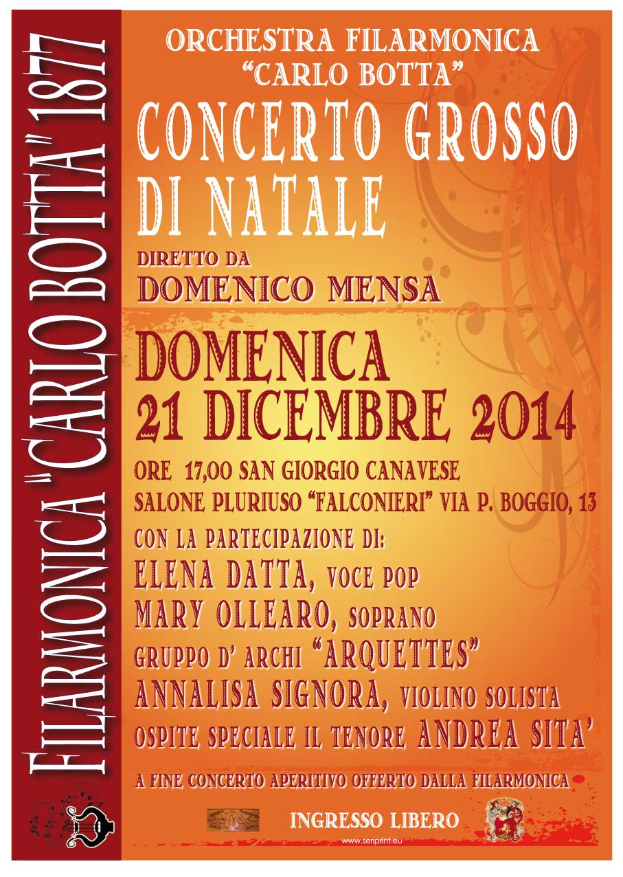 Concerto della FILARMONICA "CARLO BOTTA" diretto da Domenico MENSA, DOMENICA 21 DICEMBRE 2014 ore 17:00 presso il Salone Pluriuso "Falconieri" con la partecipazione di Elena DATTA (voce pop), Mary OLLEARO (soprano), il gruppo d'archi "ARQUETTES", Annalisa SIGNORA (violinista solista) e ospite speciale il tenore Andrea SITA'. Ingresso libero