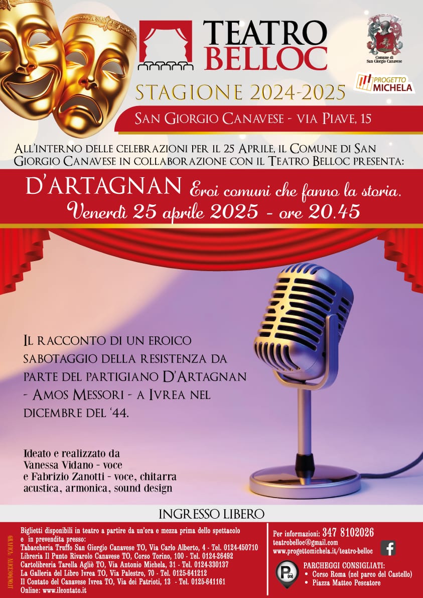 All’interno delle manifestazioni per il 25 aprile del Comune di San Giorgio Canavese, Vanessa Vidano (giornalista e antropologa) e Fabrizio Zanotti (cantautore e musicista) presentano “D’Artagnan eroi comuni che fanno la storia”.