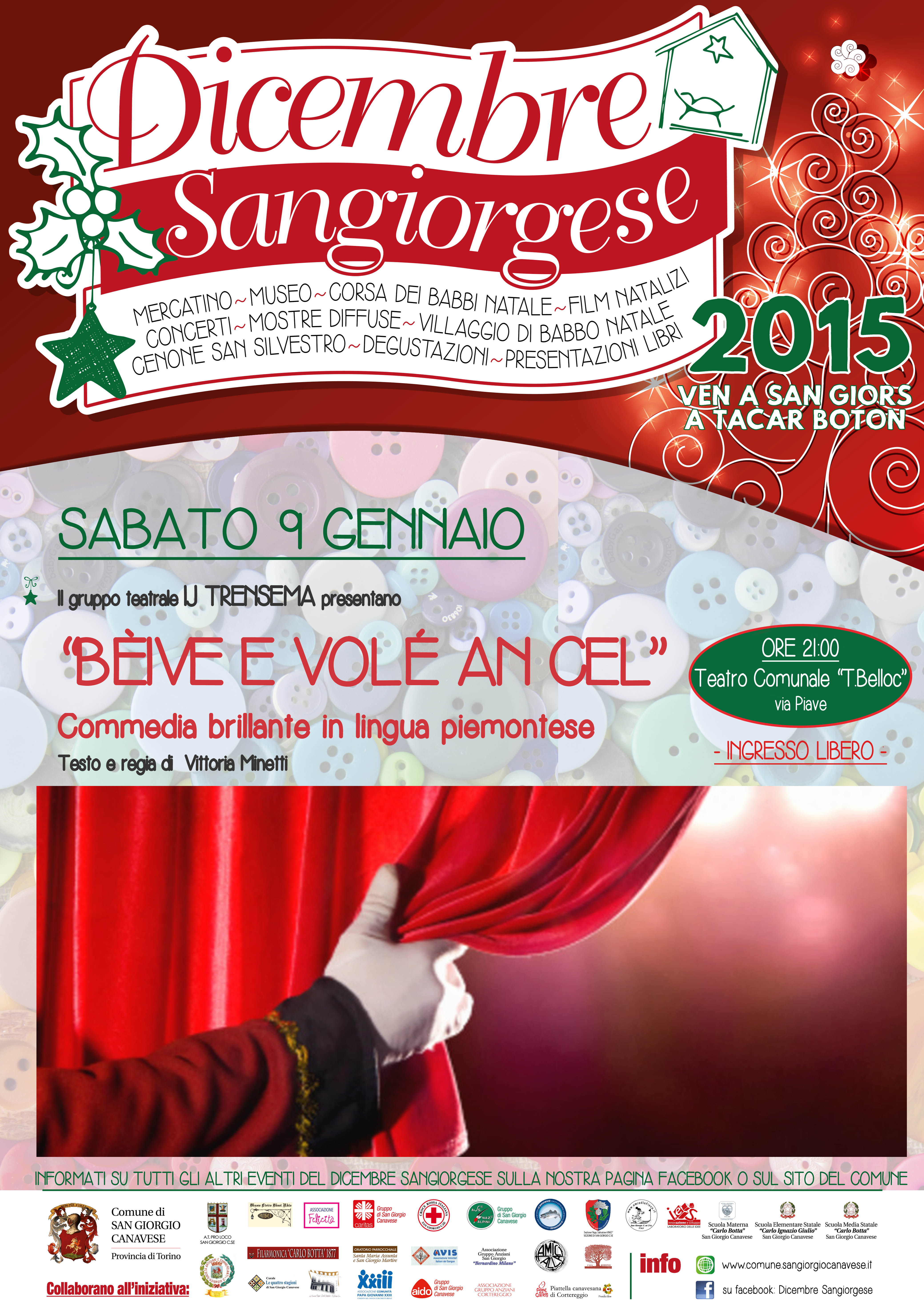 Ultimo appuntamento del Dicembre Sangiorgese: la AT Pro Loco San Giorgio Canavese sabato 9 gennaio alle ore 21:00 presso il teatro comunale "T.Belloc" presenta il gruppo teatrale "IJ TRENSEMA" con la commedia brillante in lingua piemontese "Bèive e volé an cel". Ingresso gratuito
