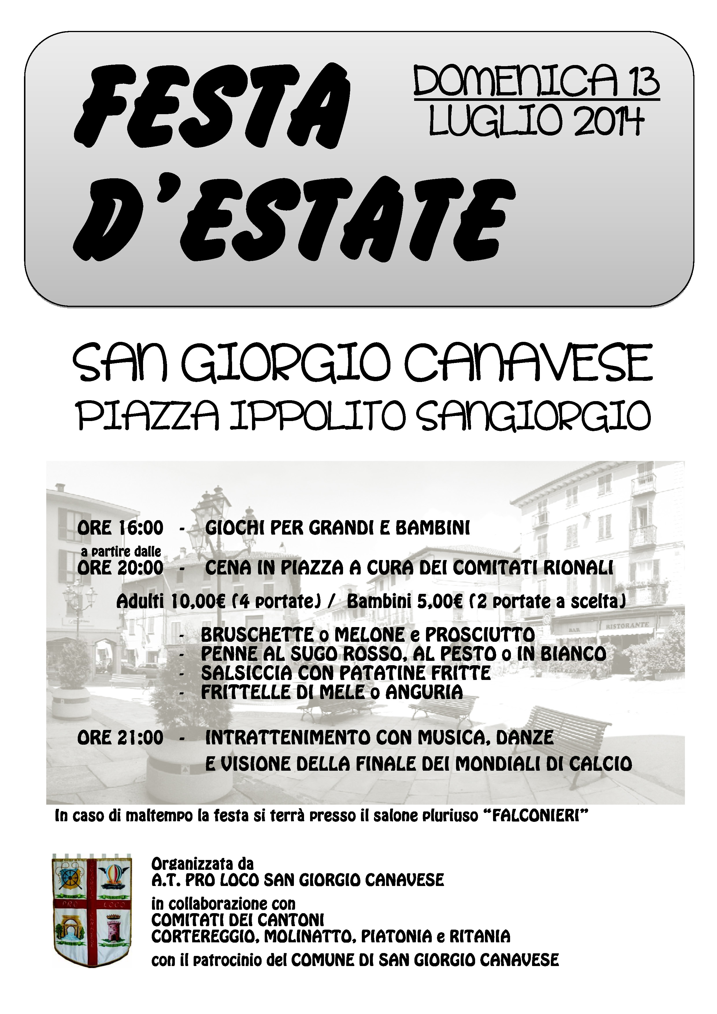La A.T. Pro Loco San Giorgio in collaborazione con i comitati rionali Cortereggio, Molinatto, Piatonia, Ritania organizza nell'incantevole cornice di piazza Ippolito Sangiorgio la II Festa d'Estate.