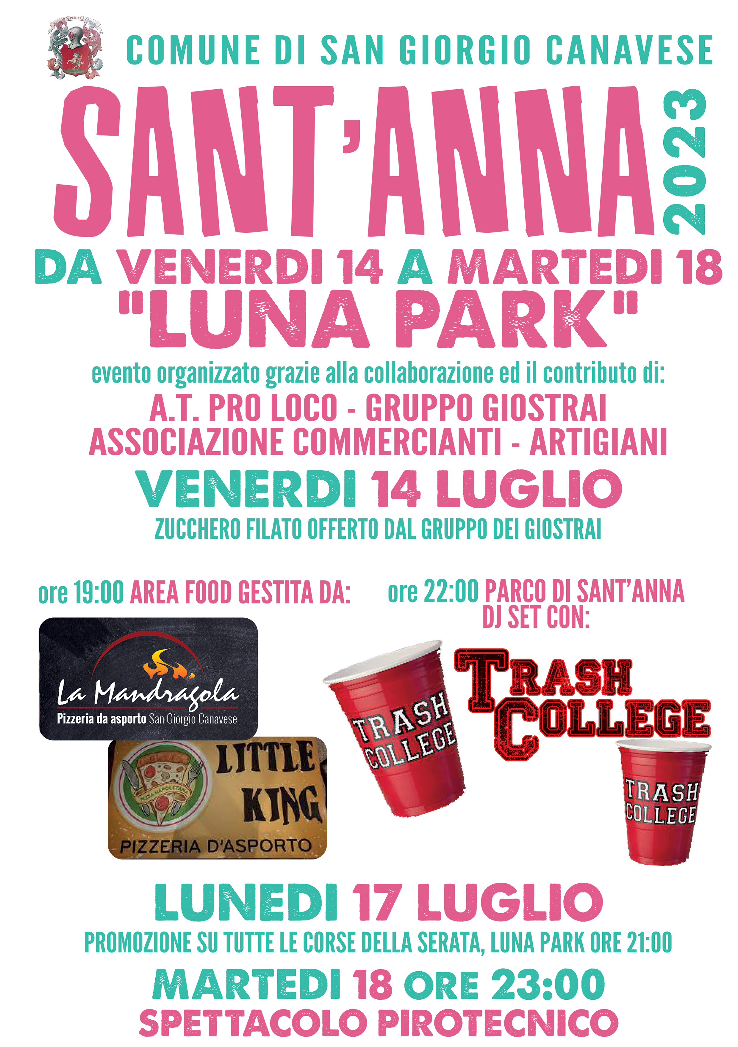 Il Comune di San Giorgio Canavese in collaborazione con AT PRO LOCO, GRUPPO GIOSTRAI, ASSOCIAZIONE COMMERCIANTI e ARTIGIANI vi invita ai festeggiamenti di SANT'ANNA da venerdì 14 luglio a martedì 18 luglio.