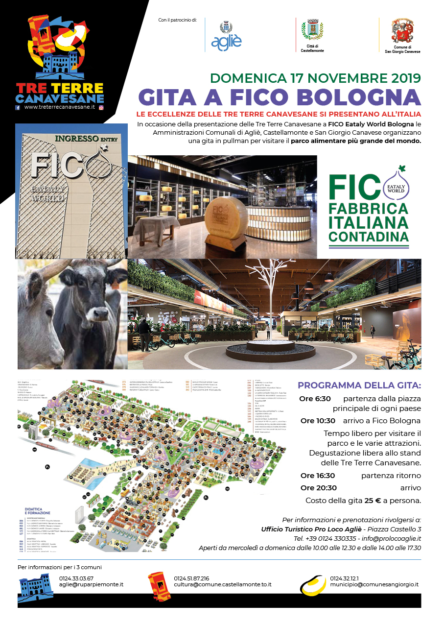 Domenica 17 novembre 2019 in occasione della presentazione delle Tre Terre Canavesane a FICO Eataly World Bologna le Amministrazioni Comunali di Agliè, Castellamonte e San Giorgio Canavese organizzano una gita in pullman per visitare il parco alimentare più grande al mondo.