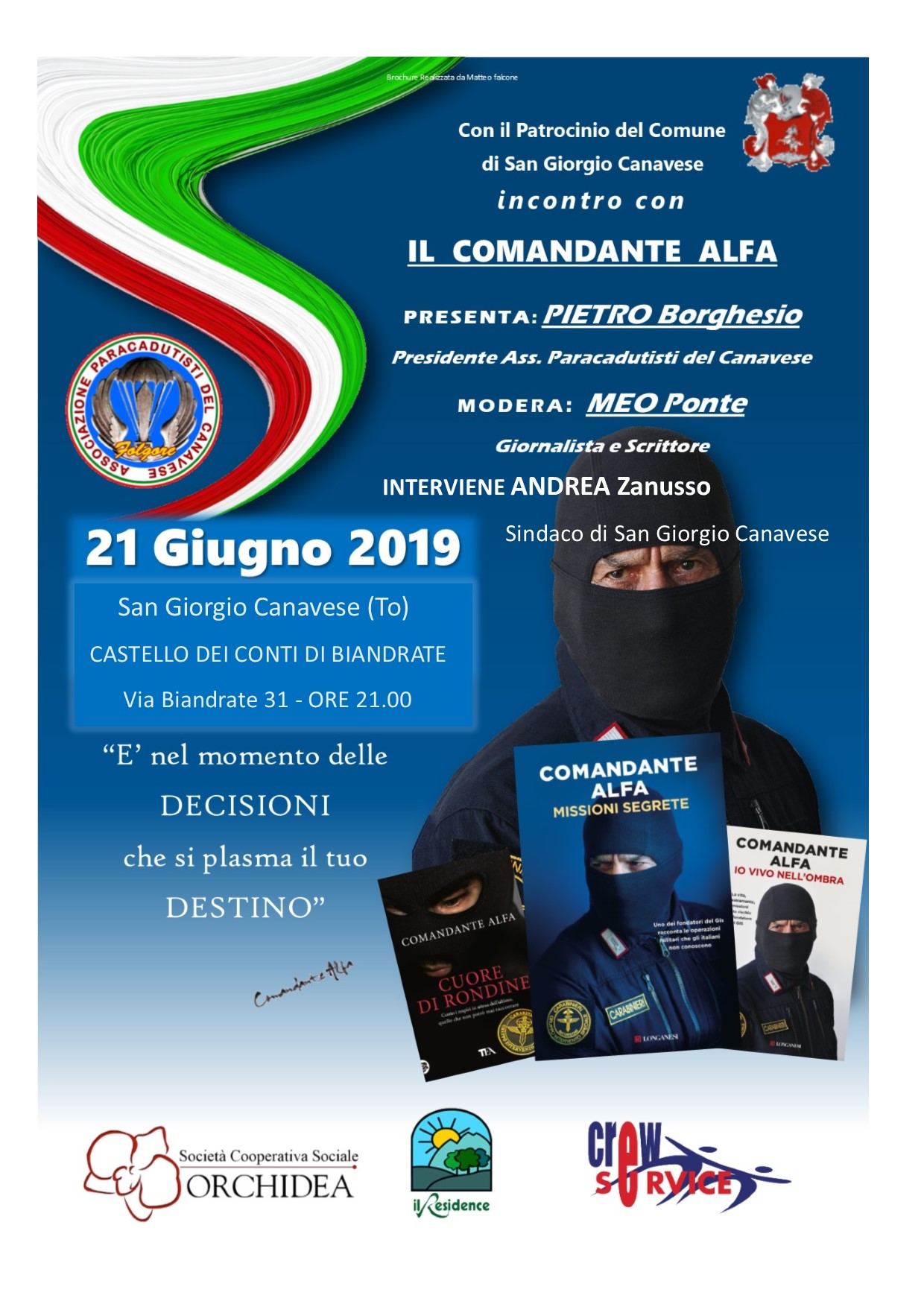 L'incontro con il Comandante Alfa, cofondatore dei GIS dell'Arma dei Carabinieri, si terrà venerdì 21 Giugno 2019 alle ore 21.00 presso il Castello di San Giorgio Canavese, in via Biandrate 31.
