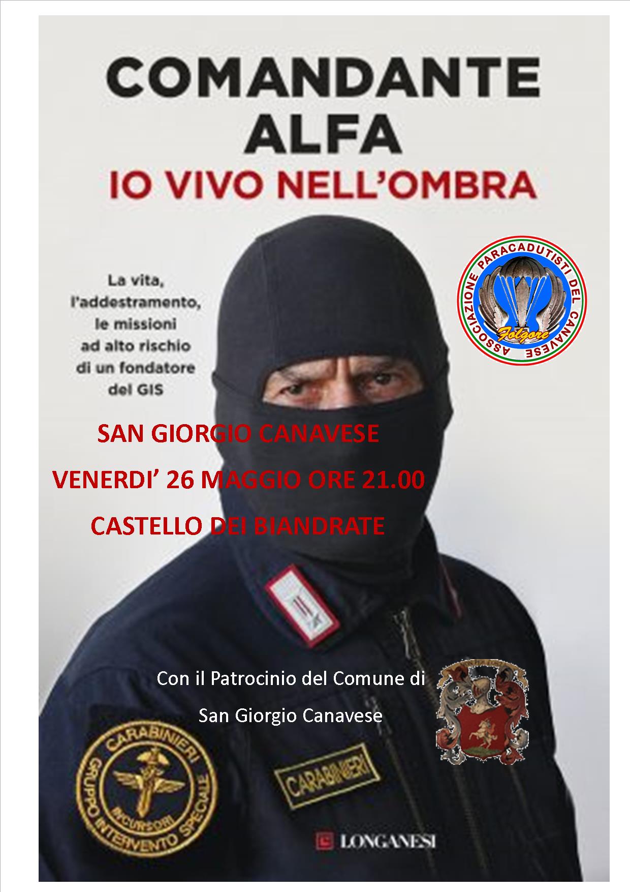 Venerdì 26 maggio alle 21:00, l'Associazione Paracadutisti del Canavese, con il patrocinio del Comune di San Giorgio Canavese, presso il Castello di San Giorgio avrà ospite il Comandante Alfa che presenterà il suo nuovo libro "IO VIVO NELL'OMBRA" .