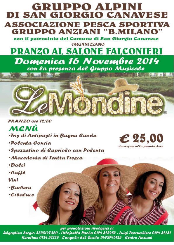 Il Gruppo Alpini di San Giorgio Canavese, l'Associazione Pesca Sportiva e il Gruppo Anziani "B.Milano" organizzano presso il Salone Pluriuso Falconieri un pranzo con la presenza del Gruppo Musicale "Le Mondine".