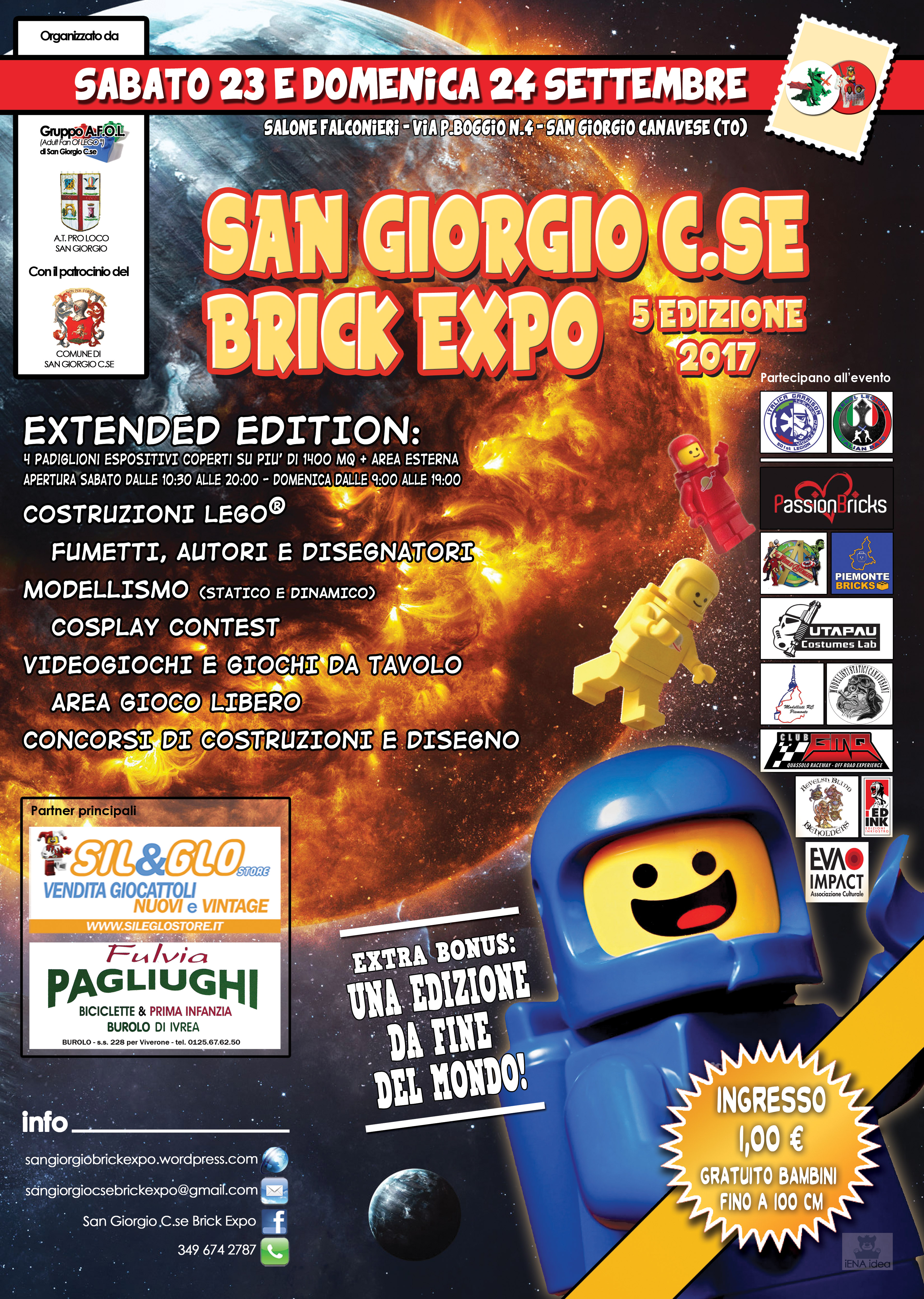 Il gruppo AFOL (Adult Fan of Lego®) di San Giorgio C.se con il patrocinio del Comune di San Giorgio Canavese ed in collaborazione con la A.T.PRO LOCO San Giorgio organizza la quinta edizione del SAN GIORGIO C.SE BRICKEXPO, quest'anno in versione EXTENDED.