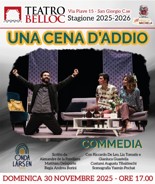 Il 30 novembre, il Teatro Belloc di San Giorgio Canavese, ospiterà "Una Cura d'Addio"; una commedia inedita in Italia e tradotta dal francese appositamente per la compagnia Onda Larsen.