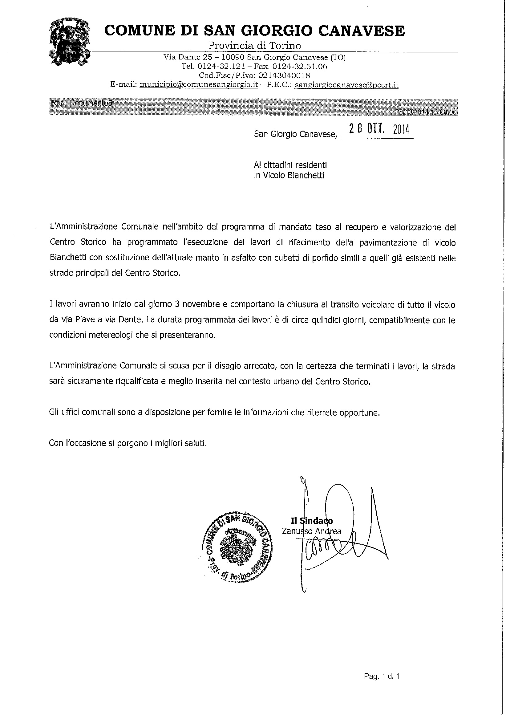 L'Amministrazione Comunale nell'ambito di mandato teso alla sistemazione della viabilità comunale ha programmato una serie di lavori di rifacimento della pavimentazione stradale nel Capoluogo e nella Frazione. Tali lavori si inseriscono nel più ampio progetto di RIVALORIZZAZIONE E RIVITALIZZAZIONE DEL CENTRO ABITATO. Con la certezza di ottenere al termine una sicura riqualificazione dell'abitato, ci scusiamo per i disagi arrecati. Le opere saranno terminate, o in caso di maltempo sospese, in data 05/12/2014 per eventualmente riprendere dopo le festività natalizie.