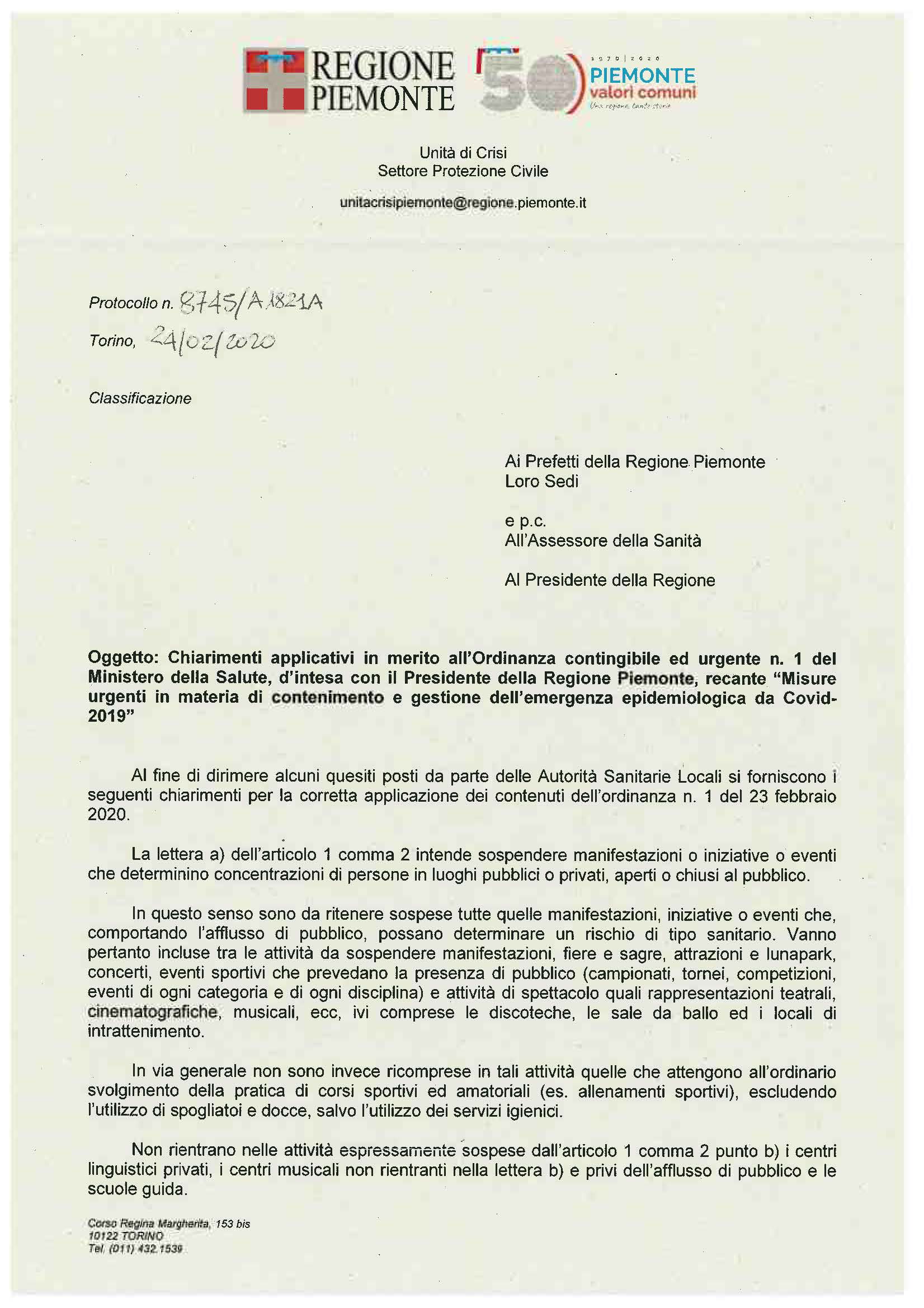 La Regione Piemonte Unità di Crisi Settore Protezione Civile ha emesso una Circolare contenente chiarimenti applicativi in merito all'Ordinanza contingibile ed urgente n.1 del Ministero della Salute, d'intesa con il Presidente della Regione Piemonte, recante "Misure urgenti in materia di contenimento e gestione dell'emergenza epidemiologica da Covid-2019"
