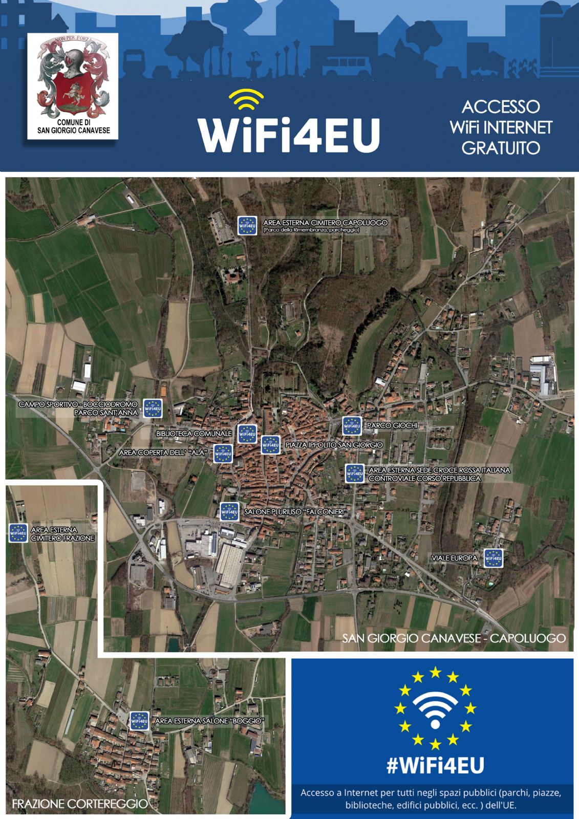 Beneficiando dei finanziamenti nell'ambito dell'iniziativa europea WiFi4EU in alcune aree selezionate del territorio di San Giorgio Canavese è ora possibile connettersi gratuitamente e in piena mobilita al servizio di accesso libero Wi-Fi internet.