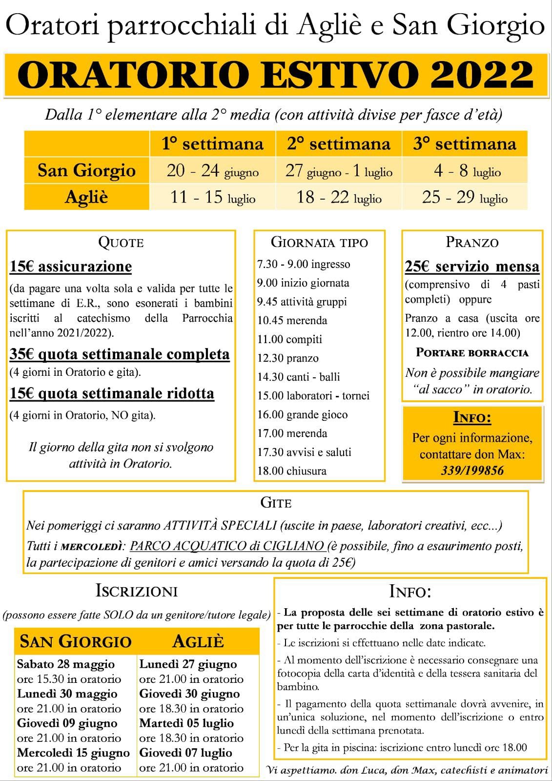 Gli oratori parrochiali di San Giorgio e Agliè propongono l'ORATORIO ESTIVO 2022.