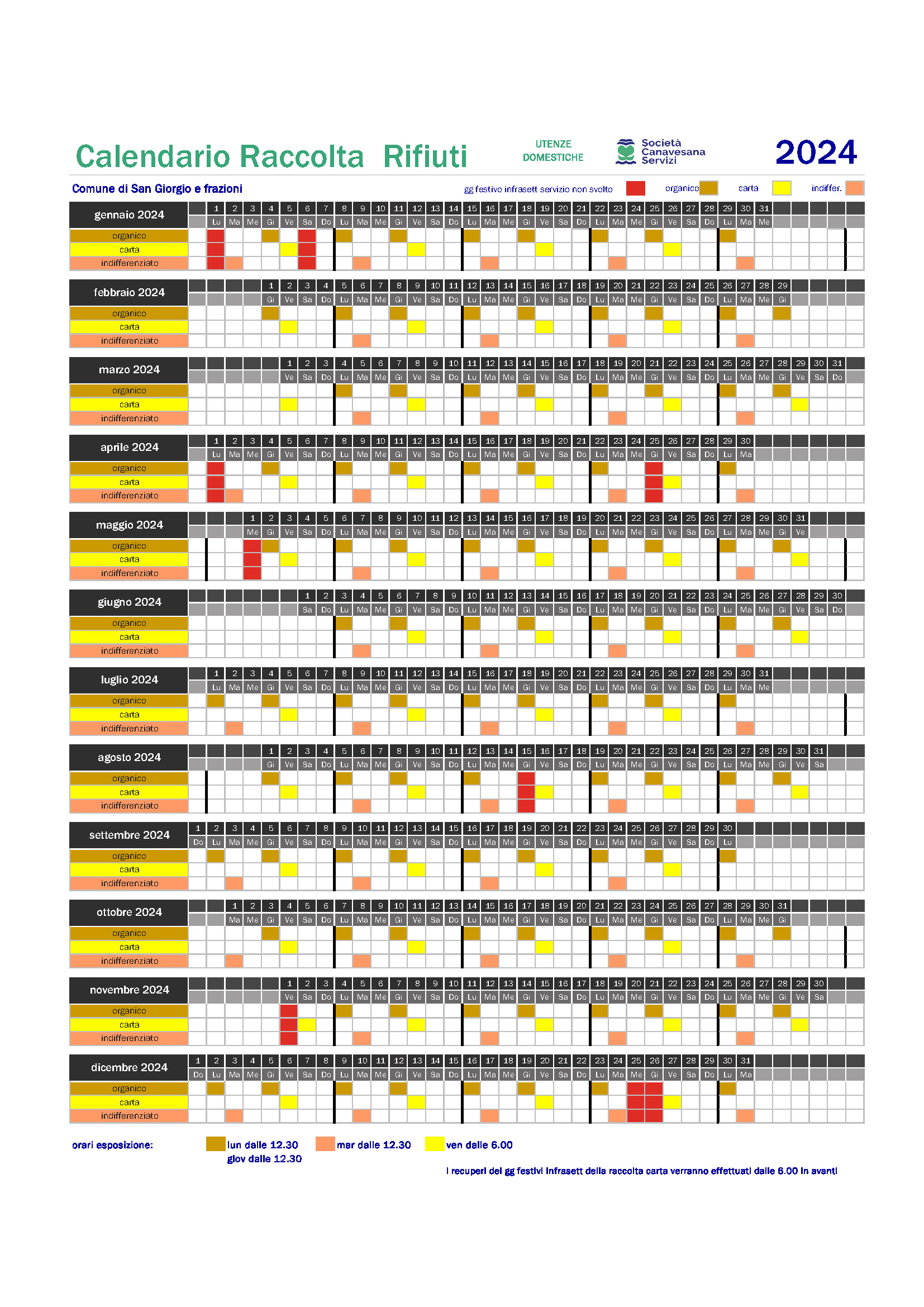 Il calendario della raccolta rifiuti per il 2024 e relative modalità di conferimento è visionabile e scaricabile dal sito SCS cliccando sul link indicato.