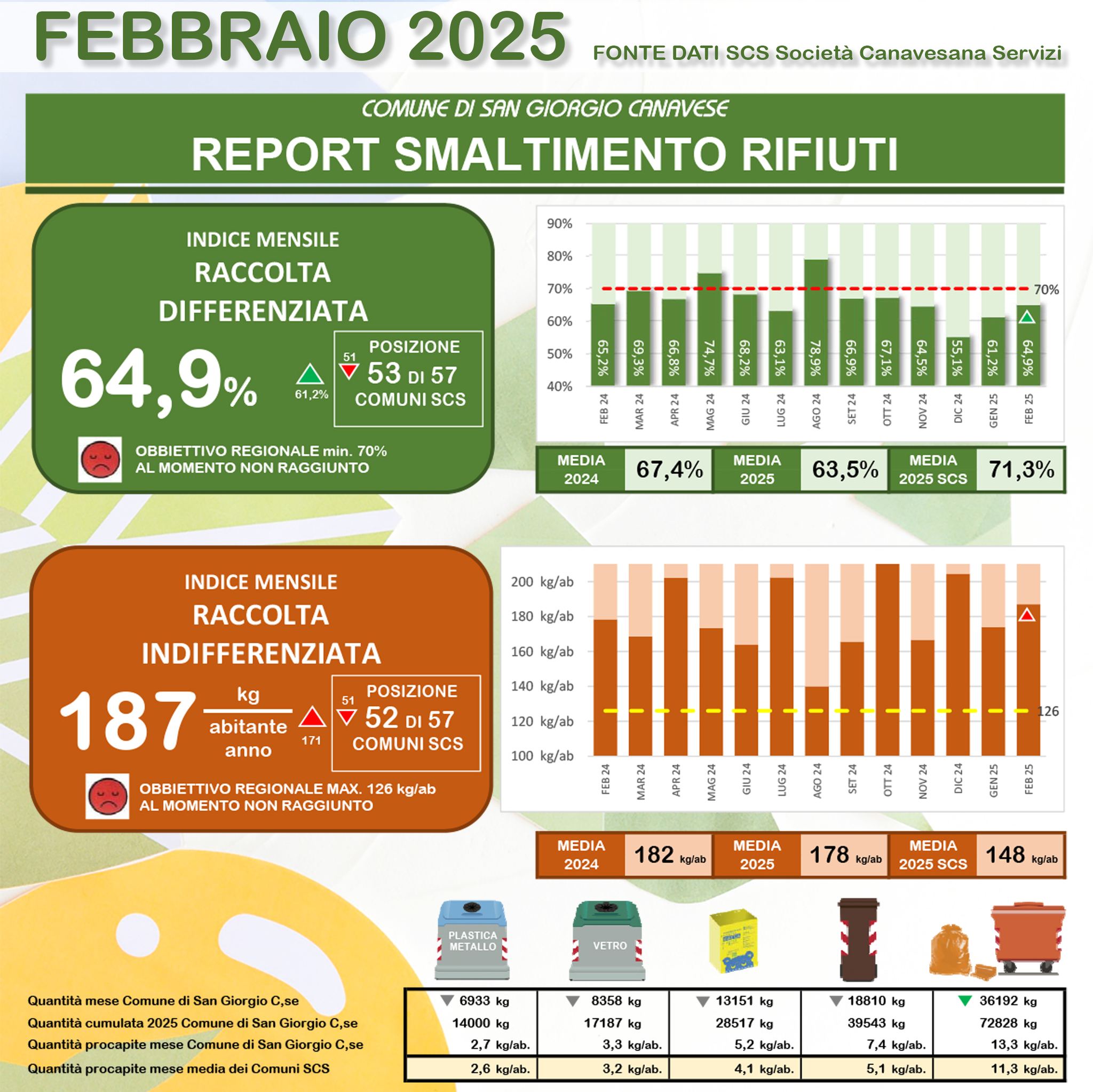 Dall'analisi dei dati mensili forniti da SCS per il mese di marzo 2025 il Comune di San Giorgio migliora il livello di differenziazione con il valore di 70,5%, raggiungendo il limite regionale pari almeno al 70%. Purtroppo per l'indifferenziata aumenta la quantità in termini assoluti (si riduce l'indice mensile procapite annuo solo grazie al fatto che il mese di marzo ha più giorni di febbraio).