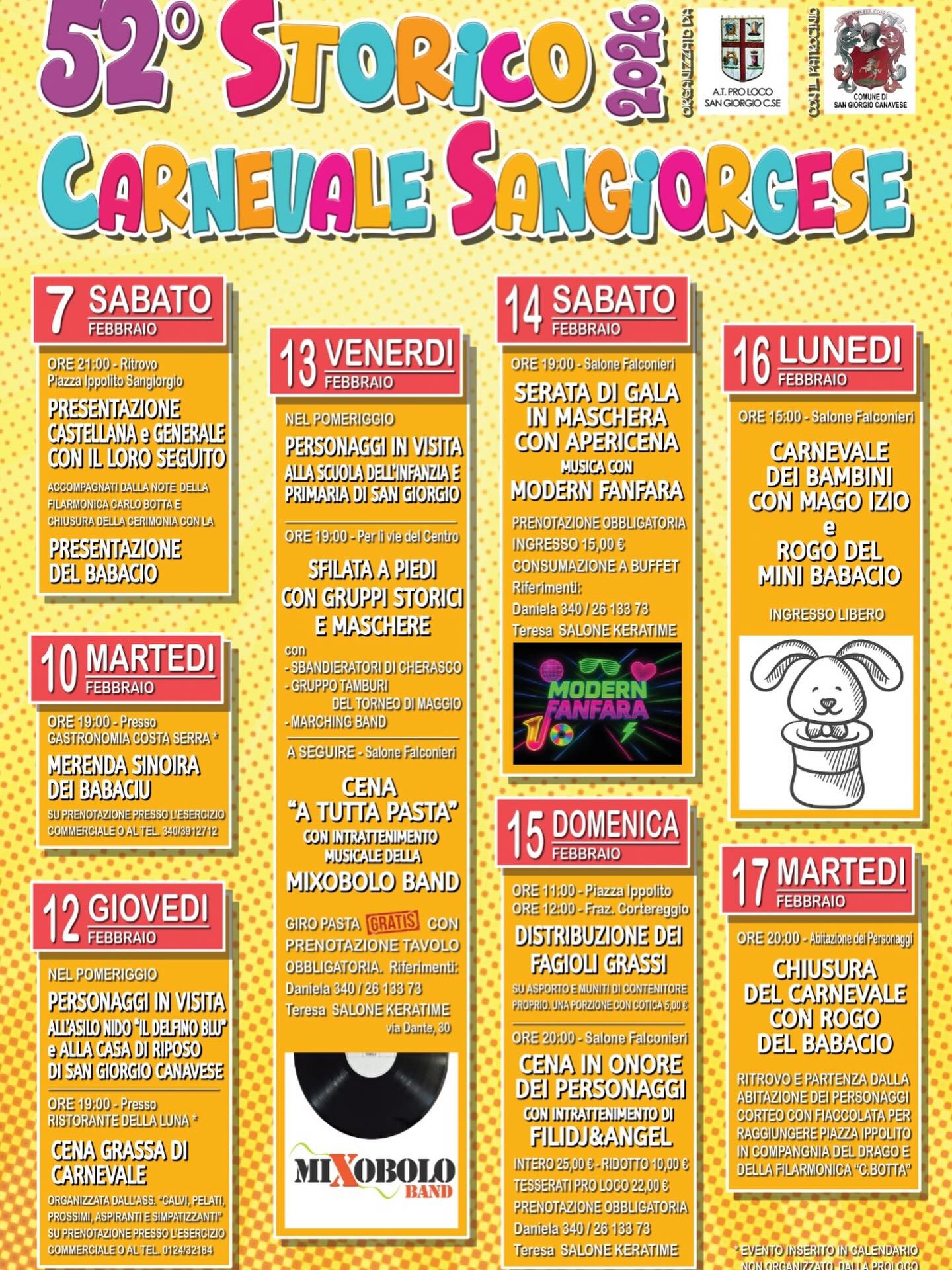 La AT Pro Loco San Giorgio Canavese, con il patrocinio del Comune, presenta il programma ufficiale della 52ª edizione dello Storico Carnevale Sangiorgese!