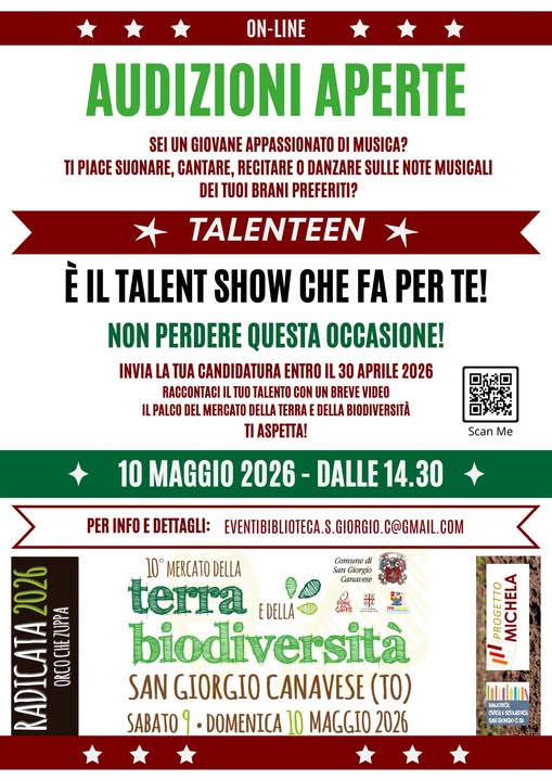 La Biblioteca Civica di San Giorgio Canavese, in collaborazione con l’Amministrazione e l’Associazione Progetto Michela, invita i giovani cantanti, musicisti, ballerini, attori, ecc a partecipare a TALENTEEN: un’opportunità per i ragazzi in cui mettere in gioco il loro talento attraverso una performance musicale a loro scelta.