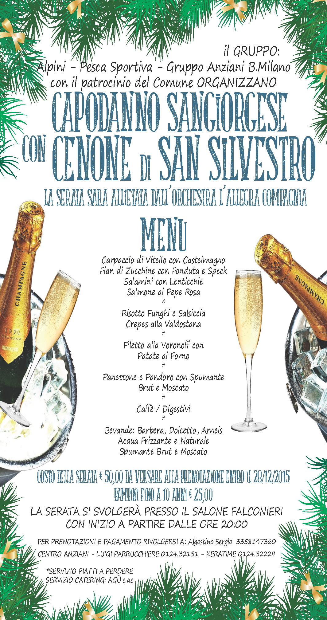 Il Gruppo Alpini, Pesca Sportiva, Gruppo Anziani B.Milano nel contesto del Dicembre Sangiorgese organizzano: CAPODANNO SANGIORGESE con CENONE di SAN SILVESTRO. La serata sarà allietata dall'orchestra l'Allegra Compagnia.