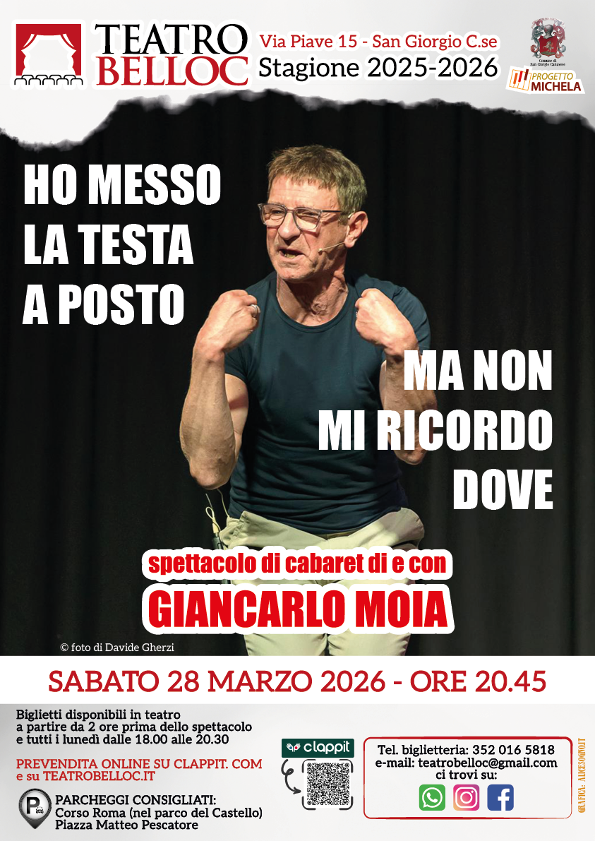 Sabato 28 marzo, il Teatro Belloc di San Giorgio canavese, ospiterà lo spettacolo di cabaret di Giancarlo Moia "Ho messo la testa a posto ma non mi ricordo dove".