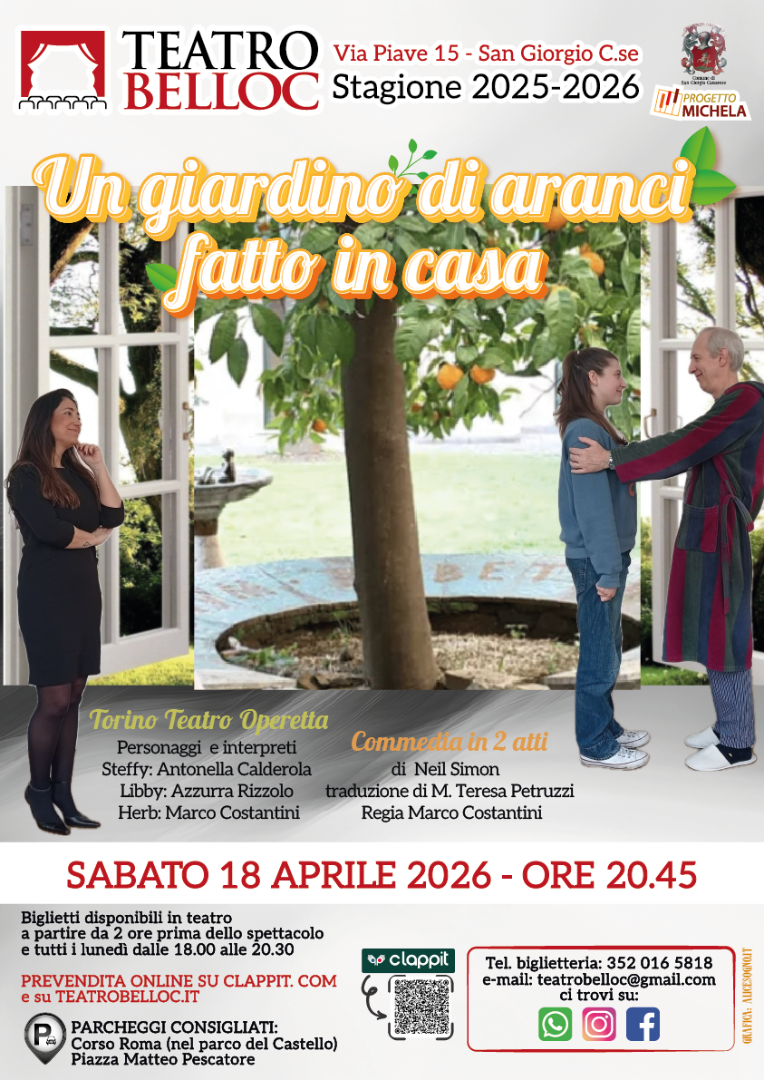 Sabato 18 aprile, il Teatro Belloc di San Giorgio Canavese, ospiterà "Un giardino di aranci fatto in casa"